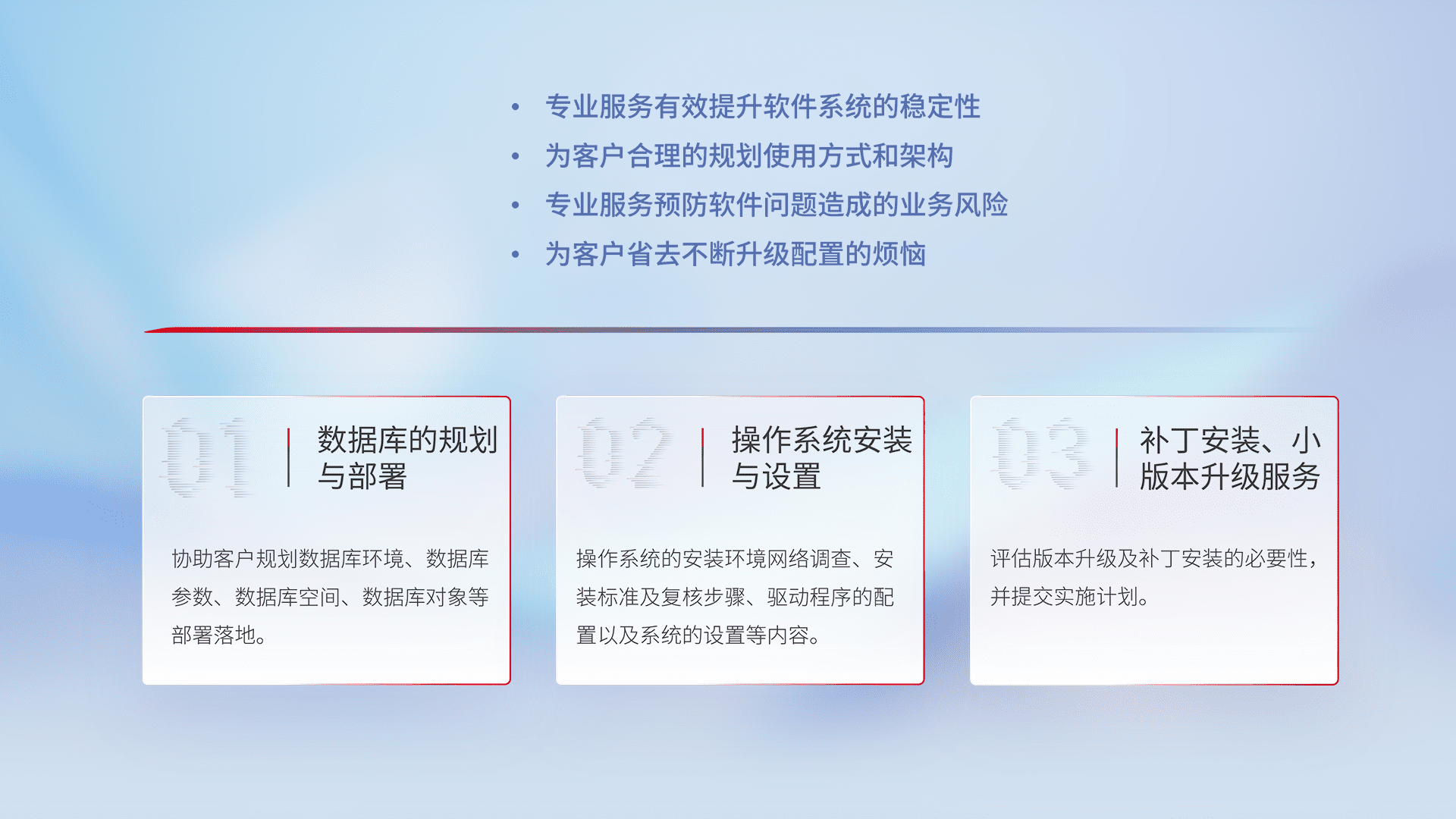 为客户提供软件规模升级、、、快速部署、、、按需配置的专业服务,,从数据库的规划与部署到操作系统的安装与设置,,再到补丁安装和小版本升级提供支持。。